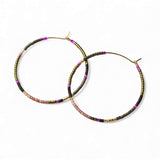 Amp up your beauty with these colorful beaded hoops. Available in 2 endlessly wearable sizes. Shown here in shades of olive, gold and pink.