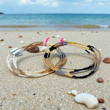 Our Rumi beaded bracelets feature patterns inspired by global textiles and heirloom beading. We've color-blocked bold hues for a fun spring look. Set of 4 stretch bracelets. Stack 'em up! 6 1/2" around. Glass beads.